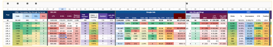 - Integrated data from Google Ads, product analytics (Heap Analytics), SEO crawls, and web analytics