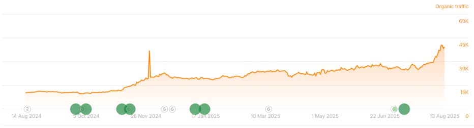 - 4x organic traffic growth: From 10K to 40K+ monthly visitors
